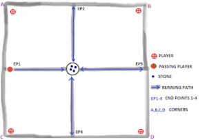 ബാക്കിയുള്ള നാലുപേരും, ചതുരങ്ങളുടെ ഓരോ മൂലയിൽ [A,B,C,D] ആയി നിലയുറപ്പിയ്ക്കുന്നു. പാസടിയ്ക്കുന്ന ആൾ ചിത്രത്തിൽ കാണിച്ചിരിയ്ക്കുന്ന ‘പാസിംഗ് പാത’ വഴി പതുക്കെ കൈകൾ തമ്മിൽ കൊട്ടിക്കൊണ്ട് ഓടുന്നു. EP1ൽ നിന്നും തുടങ്ങി EP2/EP3/EP4 ൽ എത്തി വീണ്ടും EP1 ൽ തിരിച്ചെത്തുമ്പോൾ, അയാൾ ഉറക്കെ വിളിച്ചു പറയും “ഒകെ ….പാസ്സടിച്ചു”.