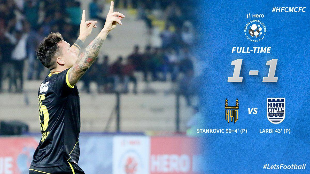 ഹീറോ ഇന്ത്യൻ സൂപ്പർ ലീഗിലെ ആറാം സീസണിലെ ഇന്നലെ നടന്ന മുംബൈ സിറ്റി, ഹൈദരാബാദ് എഫ് സി മത്സരം സമനിലയിൽ പിരിഞ്ഞു. പ്ലേ ഓഫ് ഉറപ്പിക്കാൻ എത്തിയ മുംബൈയെ ഹൈദരാബാദ് സമനിലയിൽ തളക്കുകയായിരുന്നു. രണ്ട് ടീമുകളും ഓരോ ഗോൾ വീതം നേടിയാണ് മൽസരം അവസാനിച്ചത്. ഒരു ഗോളിന് മുന്നിൽ നിന്നതിന് ശേഷമാണ് മുംബൈ സമനിലയിൽ ഒതുങ്ങിയത്. ലാര്ബി മുംബൈക്ക് വേണ്ടി ഗോൾ നേടിയപ്പോൾ, സ്റ്റാങ്കോവിച് ആണ് ഹൈദരാബാദിന് സമനില ഗോൾ നേടിക്കൊടുത്തത്. രണ്ട് ടീമും പെനാൽറ്റിയിലൂടെയാണ് ഗോൾ നേടിയത്.