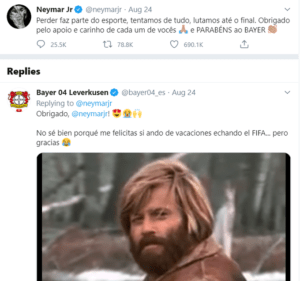 അദ്ദേഹം ട്വിറ്ററില് കുറിച്ചത് ഇങ്ങനെ ““തോൽക്കുന്നത് കായികരംഗത്തിന്റെ ഭാഗമാണ്, ഞങ്ങൾ എല്ലാം പരീക്ഷിക്കുന്നു, അവസാനം വരെ ഞങ്ങൾ പോരാടുന്നു. നിങ്ങൾ ഓരോരുത്തരുടെയും പിന്തുണയ്ക്കും വാത്സല്യത്തിനും നന്ദി ആശംസകള് ബയര്.”അവസാന അക്ഷരം (n) ചേര്ക്കാന് അദ്ദേഹം മറന്നു.ഇതിന് മറുപടിയായി ലേവര് കുസന് തങ്ങളുടെ ട്വിറ്റര് അക്കൌണ്ടില് ഇങ്ങനെ കുറിച്ചു “ഞങ്ങള് ഇവിടെ ഫിഫ കളിക്കുകയാണ്.എന്തിനാണ് എന്നെ അഭിനന്ദിക്കുന്നത് എന്ന് എനിക്ക് മനസിലായില്ല.പക്ഷേ നന്ദി.”