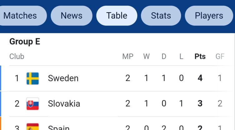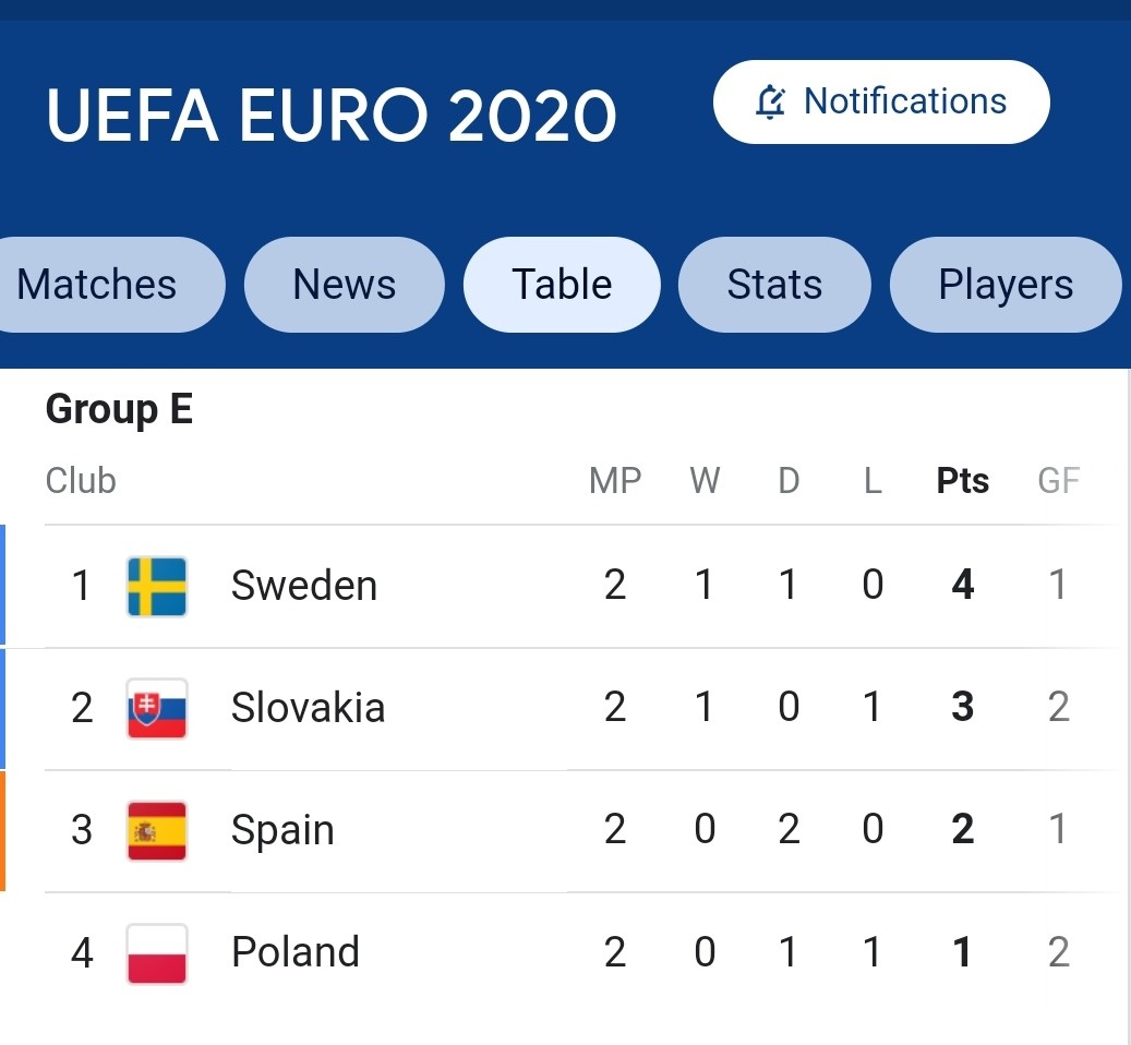 നിലവിൽ 4 പോയിൻ്റുമായി സ്വീഡൻ ആണ് ഗ്രൂപ്പിൽ ഒന്നാമത്. ഒരു വിജയവുമായി സ്ലോവേക്കിയ ആണ് 2 മത്. രണ്ട് സമനിലയുമായി 3 മത് ആണ് സ്പെയിൻ. ഒരു സമനിലയുമായി ഗ്രൂപ്പിൽ ഒരു പോയിൻ്റുമായി 4 മത് ആണ് പോളണ്ട്.