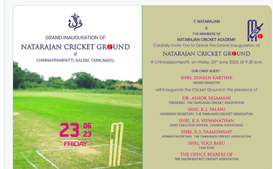 ക്രിക്കറ്റ് താരം തന്റെ ഔദ്യോഗിക ട്വിറ്റർ ഹാൻഡിൽ എഴുതി, “എന്റെ സ്വപ്ന സാക്ഷാത്കാര പദ്ധതിയായ നടരാജൻ ക്രിക്കറ്റ് ഗ്രൗണ്ടിന്റെ ഉദ്ഘാടനം പ്രഖ്യാപിച്ചതിൽ അതിയായ സന്തോഷമുണ്ട്. – 2023 ജൂൺ 23 – ചിന്നപ്പംപട്ടി, സേലം ജില്ല.