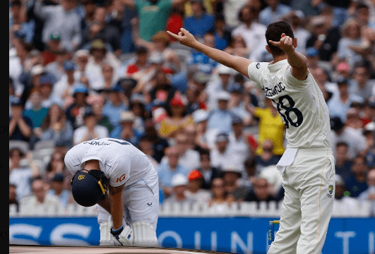 114/4 എന്ന നിലയിൽ അവസാന ദിനം പുനരാരംഭിച്ച സ്റ്റോക്‌സും ബെൻ ഡക്കറ്റും (83) 63 റൺസ് കൂട്ടിച്ചേർത്തപ്പോൾ രാവിലെ സെഷന്റെ ആദ്യ മണിക്കൂറിന് ശേഷം ജോഷ് ഹേസിൽവുഡിന് മുന്നിൽ വീണു. ബൗൺസർ ഒഴിവാക്കുന്നതിനിടയിൽ ബാറ്റർ ക്രീസിന് പുറത്തേക്ക് നീങ്ങിയ ശേഷം വിക്കറ്റ് കീപ്പർ അലക്‌സ് കാരി പന്ത് സ്റ്റമ്പിലേക്ക് എറിഞ്ഞപ്പോൾ ജോണി ബെയർസ്റ്റോ വിവാദ സാഹചര്യത്തിൽ 10 റൺസെടുത്ത് റണ്ണൗട്ടായി, ഇംഗ്ലണ്ട് 193/6 എന്ന നിലയിലായി.