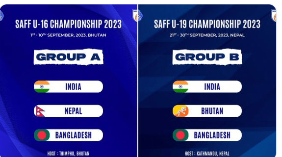 സാഫ് അണ്ടർ16 ചാമ്പ്യൻഷിപ്പ് 2023, സാഫ് അണ്ടർ19 ചാമ്പ്യൻഷിപ്പ് 2023 എന്നിവയുടെ നറുക്കെടുപ്പ് ശനിയാഴ്ച ബംഗ്ലാദേശിൽ നടന്നു. അണ്ടർ 16 ഇനത്തിൽ ഇന്ത്യ നേപ്പാളിനും ബംഗ്ലാദേശിനുമൊപ്പം ഗ്രൂപ്പ് എയിൽ ഇടം നേടി. ആതിഥേയരായ ഭൂട്ടാൻ, മാലിദ്വീപ്, പാകിസ്ഥാൻ എന്നിവ ഗ്രൂപ്പ് ബിയിൽ ആണ്. 2023 സെപ്റ്റംബർ 1 മുതൽ 10 വരെ തിംഫുവിലെ ചാംഗ്ലിമിതാങ് സ്റ്റേഡിയത്തിലാണ് സാഫ് അണ്ടർ16 ചാമ്പ്യൻഷിപ്പ് നടക്കുന്നത്.