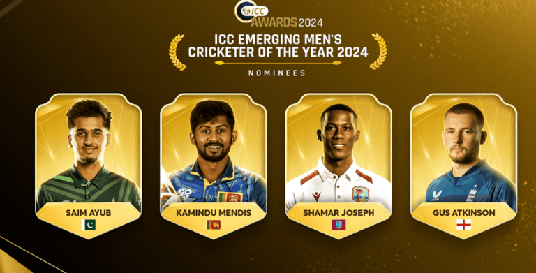 2024-ലെ ഐസിസി പുരുഷന്മാരുടെ എമർജിംഗ് ക്രിക്കറ്റർ ഓഫ് ദ ഇയർക്കുള്ള നോമിനികൾ ഗസ് അറ്റ്കിൻസൺ (ഇംഗ്ലണ്ട്), കാമിന്ദു മെൻഡിസ് (ശ്രീലങ്ക), സെയിം അയൂബ് (പാകിസ്ഥാൻ), ഷമർ ജോസഫ് (വെസ്റ്റ്...