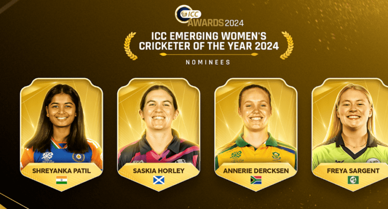 2024 ലെ ഐസിസി വനിതാ എമർജിംഗ് ക്രിക്കറ്റർ ഓഫ് ദ ഇയർ അവാർഡിന് ആൻറി ഡെർക്‌സെൻ (ദക്ഷിണാഫ്രിക്ക), സാസ്കിയ ഹോർലി (സ്കോട്ട്‌ലൻഡ്), ഫ്രേയ സാർജൻ്റ് (അയർലൻഡ്) എന്നിവരോടൊപ്പം...